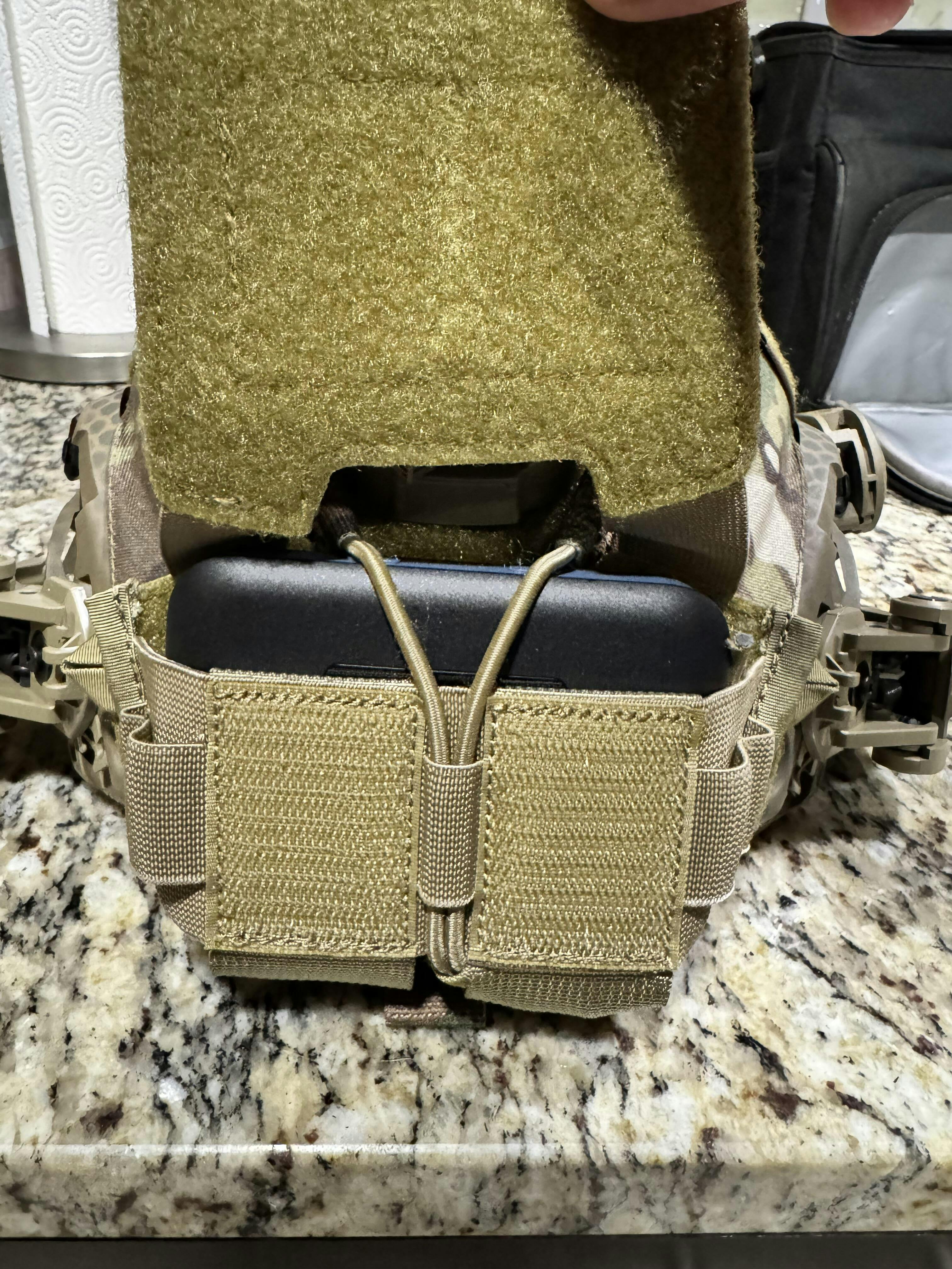 The semi-rigid pouch exterior gives rear accessories extra impact protection and has a central loop area for ID patches. It also has a lower stow area for comms PTT cables when not in use. Firmly and securely connected and yet, it can be donned and doffed in around 60 seconds so you connect or disconnect depending on your mission set.